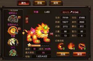 上图中的年兽是不是很帅气呢?LV80,战斗力5万1千多。粉色年兽有三个技能,其中大部分玩家会选择升级二、三俩技能。粉年兽的最打成长等级是85级,年兽后期攻击高、防御还行、就是血不够厚、但是技能暴力。值得拥有的一个活动幻兽。