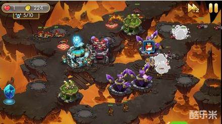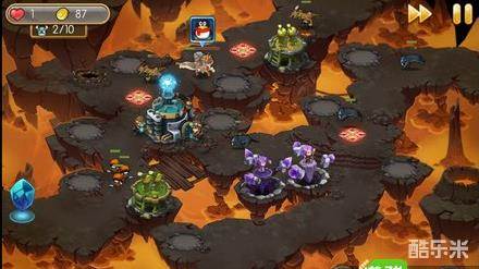 1、初始布局如下,本关建议可以使用好友助阵!中间一座雷霆炮塔,上路出口和终点处各一座箭塔。出怪后,终点处箭塔升级到3阶,右侧新建两个法师塔;