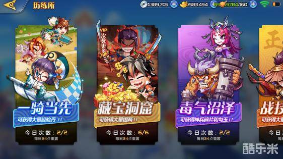 历练系统在玩家等级到达12级时便能开启,共有五个副本等待玩家挑战,他们分别为一骑当先、藏宝洞库、毒气沼泽、战技无双以及过关斩将。