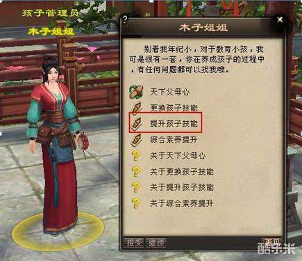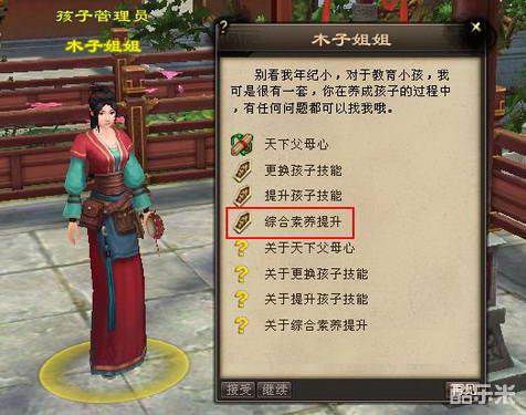 可在洛阳(151,187)木子姐姐处对子女诗、书、礼、乐、射五个养成属性进行提升。