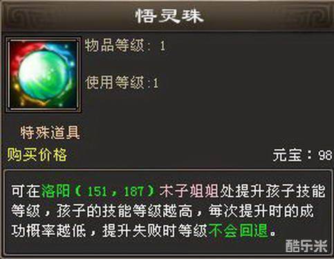 孩子技能可以在洛阳(151,187)木子姐姐处提升(需要道具:悟灵珠,可在元宝商店购得),最高为9级。