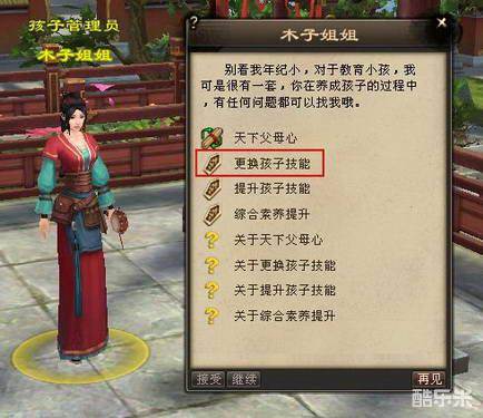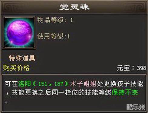 孩子技能可以在洛阳(151,187)木子姐姐处更换(需要道具:觉灵珠,可在元宝商店购得)。