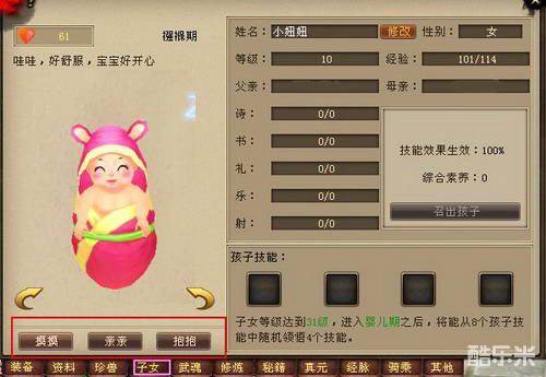 子女进入婴儿期(31级)后将开启“子女技能” “子女培养”功能(功能介绍见下文二、三部分)。