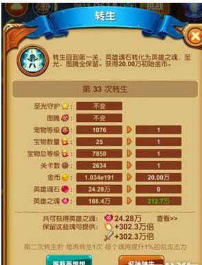 首先遇到难关,大家第一个想到就是使用转生来让自己退回原点,并且增加英雄之魂后再次挑战,但是转生后,大家一定要注意自己宝物的等级,因为转生后,宝物等级也是归零,如果不注意升级的话,虽然英雄之魂增加了,但是攻击力还是不够的。