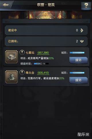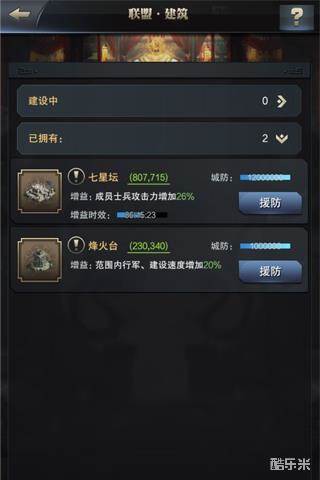 在联盟建筑中,七星坛由联盟盟主建造,其能为各位联盟成员提供增益加成。Buff一共有四种,分别是粮草加成、银两加成、攻击加成以及防御加成,而前两种又可归为资源类加成,后两种则为战斗类加成。Buff种类由盟主所选择决定,需要注意的是,每次只能选择一种Buff,而Buff持续七天之久,在这段期间,除非将七星坛拆掉重建,否则需要等待Buff时间结束,才能选择另一种加成,也就是说在Buff的选择上需要非常谨慎!每种加成选择视情况而定,才能效益最大化,助各位主公在霸业成就之路上赢在起跑线!