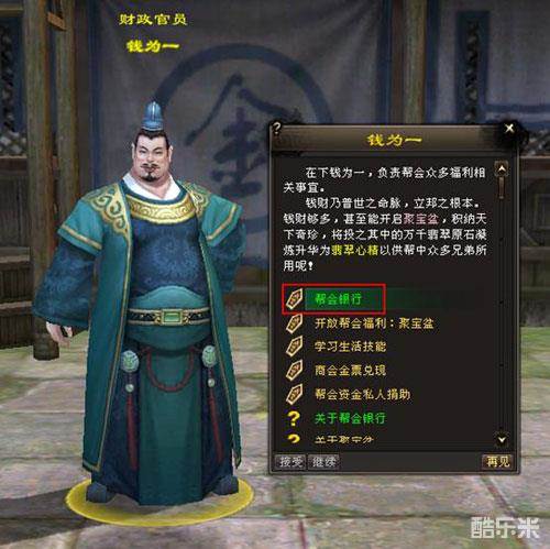 拥有帮会城市的玩家,可以前往帮会(149,56)财政官员钱为一处,点击“打开帮会银行”选项,打开帮会银行。