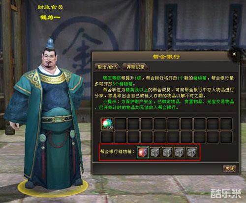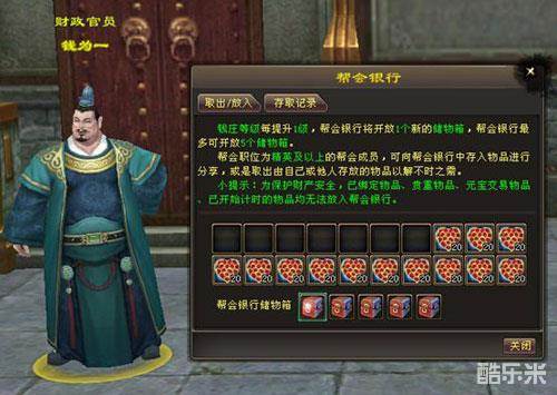 帮会职位为精英及以上的帮会成员,可以向帮会银行中存入物品,且不可存入绑定物品,贵重物品,元宝交易物品及已开始计时的物品。帮会职位为精英及以上的帮会成员,可以从帮会银行中取出由自己或是他人存放的物品。