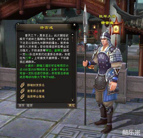 周日15:10-15:25期间,所有帮会中等级≥90级的成员,均可由其帮会的帮主、副帮主带领,组成一支6人队伍前往苏州(262,229)许言成处,报名参加群雄封赏活动。如有参战人员调整,需在报名时间之内重新组队报名。