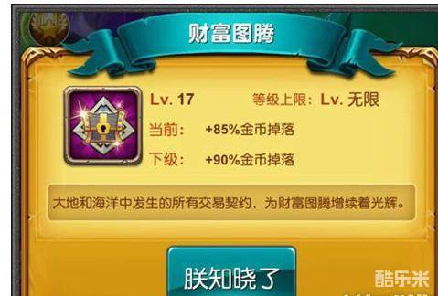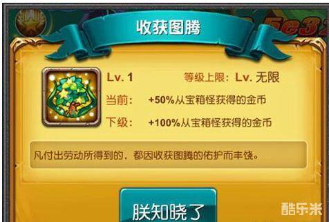 收获图腾怎么说呢,一般只有大家在闯关时碰到宝箱怪后,才能有所体会,而在挂机的时候,是完全体会不到这个图腾的作用的,所以把它放在最后,当前面3个图腾都点完了之后再升级它吧~