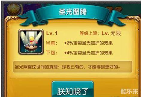在灵魂图腾与财富图腾之后,那肯定就是直接增加圣光收益的圣光图腾了,可这是可以直接增加攻击力的,那大家该有疑问了,怎么才能看出升级了是不是真的增加攻击力了呢?这里给大家个小心得,在升级圣光图腾的时候,每升级一级,就返回主界面看看自己的攻击力,如果升级后攻击力增长了,那就不用多说了,继续升级,如果没增加反而降低了,那就果断放弃继续升级,先去整合一下自己的圣光之后才继续升级。