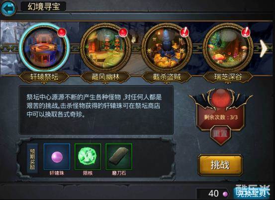 ²轩辕祭坛(每天可战斗3次)产出:轩辕珠(可在无尽宝藏的活动商店兑换道具)、陨核、磨刀石,角色等级14级开启