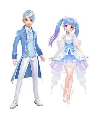 以象征深情与温柔的紫色与蓝色为主色调,女生的服饰充满了洛丽塔的浪漫风情,层层叠叠的紫色裙摆展现出巨蟹座的温柔多情。男生的深蓝色长款礼服配以海蓝色的宝石胸针,还有银色的图腾纹饰,仿佛英俊帅气的王子。