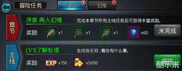 主线任务是前期玩家升级的经验主要来源地,《无终仙境》里主线任务还是比较简单的,通常以对话以及过副本来完成,战斗副本不仅能获得战斗副本经验,也能获得任务经验奖励,偷偷告诉你:每通关一个副本章节,都可以获得装备,钻石等奖励哦~