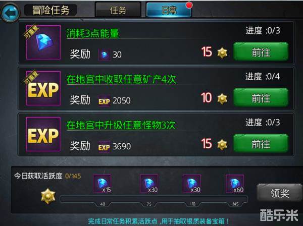 日常任务每天有10个,日常任务奖励有经验奖励,也有钻石和道具奖励,不同任务,奖励也是不同的哦~并且完成日常任务可以获得固定的活跃值,达到固定的活跃值,还能领取活跃值钻石奖励,活跃值还能用于招募装备呢!所以一定不要错过。日常任务都挺简单的,基本上都是一些系统活动。