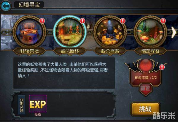嗯哼~终于说到五大幻境了,五大幻境分为轩辕祭坛,藏风幽林,截杀盗贼,瑞芝深谷,和昆仑矿脉,相信聪明的你们看幻境名字就知道五大幻境产出的资源了,藏风幽林是经验产出的巨大来源(每天可战斗2次),千万不要错过!!!千万不要错过!!!千万不要错过!!!重要的事情要说三遍。