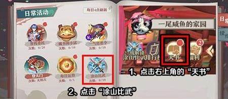 活动入口:点击右上角的【天书】,然后在红线天书的“日常活动”中,找到【涂山比武】。