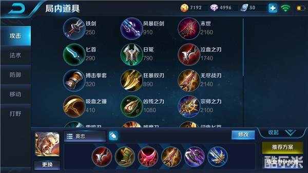解析:泣血之刃提供一定的物理攻击和物理吸血,保证了黄忠前期在线上的续航能力。鞋子选择影忍之足,可以减少敌方物理英雄对黄忠所造成的伤害,提高他的生存能力。