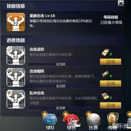 1.威力进阶:抽射或凌空额外增加20%射门或高空威力。射正率降低25%