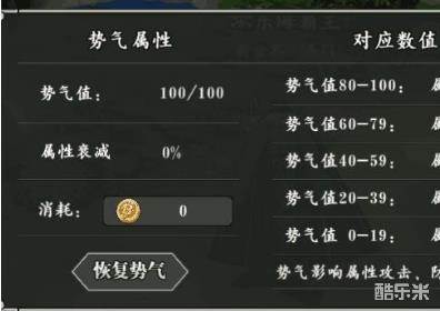 这个数值位于左上角信息栏处,出现大幅度变化时会影响属性,小幅度变化不影响,数值降至80以下(79-00分别衰减对应属性。恢复势气,点击恢复势气即可,需要花费一定金币。