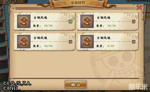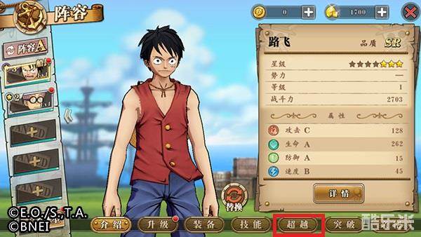 超越也是提升角色属性的重要途径之一,而超越使用的材料,就是同样的角色,或者30个角色碎片,或者30个古铜战魂!以路飞超越为例: