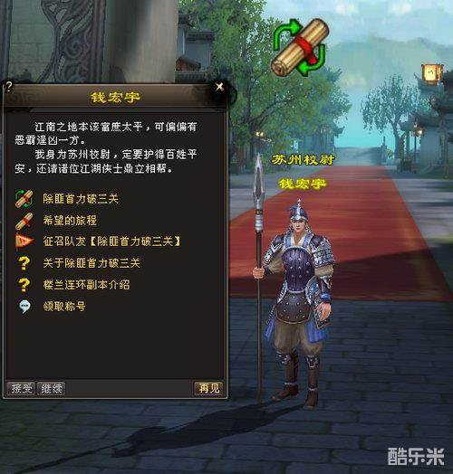 每天可在苏州(134,260)钱宏宇处领取5次任务:除匪首力破三关。成功领取任务后,与其他玩家组成3-6人小队,即可通过苏州(134,260)钱宏宇传入场景:三才峡谷。