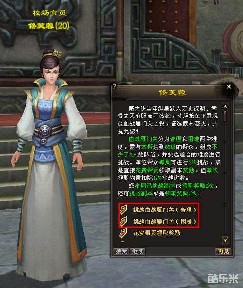玩家与本帮帮众组成不少于3人的队伍,前往帮会城市(147,95)佟芙蓉处,选择挑战不同难度的血战雁门关副本,副本中途玩家若离开副本则无法再次进入。