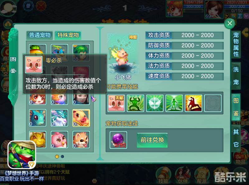 神兽小飞猪,天赋零必杀:攻击敌方,当造成的伤害数值个位数为0时,则必定造成必杀。