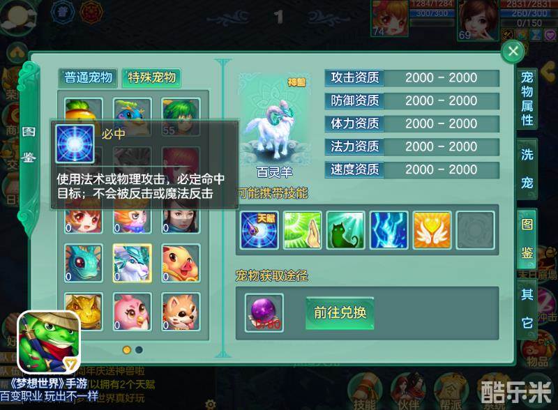 神兽百灵羊,天赋必中:使用法术或物理攻击,必定命中目标;不会被反击或魔法反击。