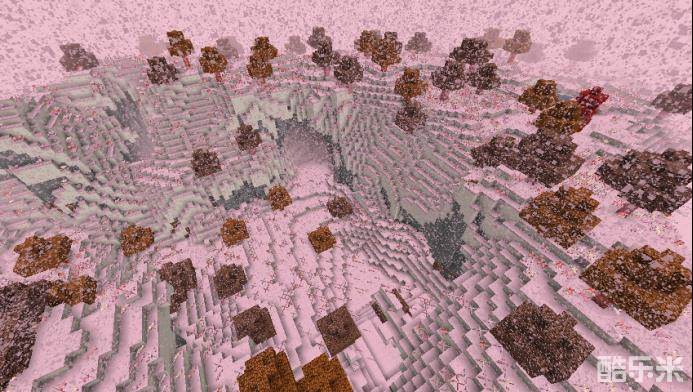 亦或是长着稀稀拉拉树的高山,山上的树叶都是棕红色的样子,而地面与天空却是粉萌萌的。如果下起雪来,显得寒冷又寂静。