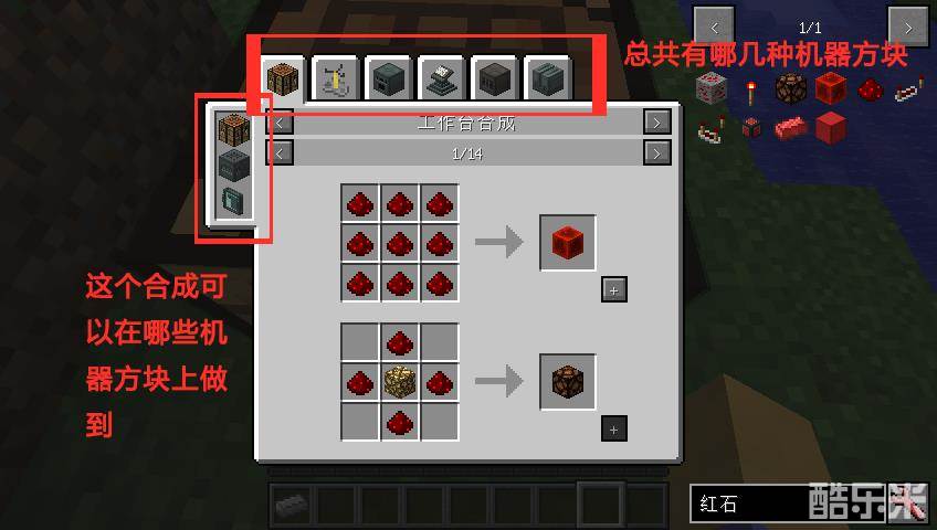 上侧是所有能够操作的机器方块。比如图中红石能够在工作台、炼药台等好几种机器中进行相关合成。