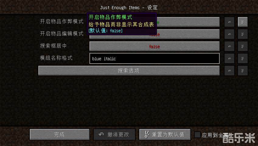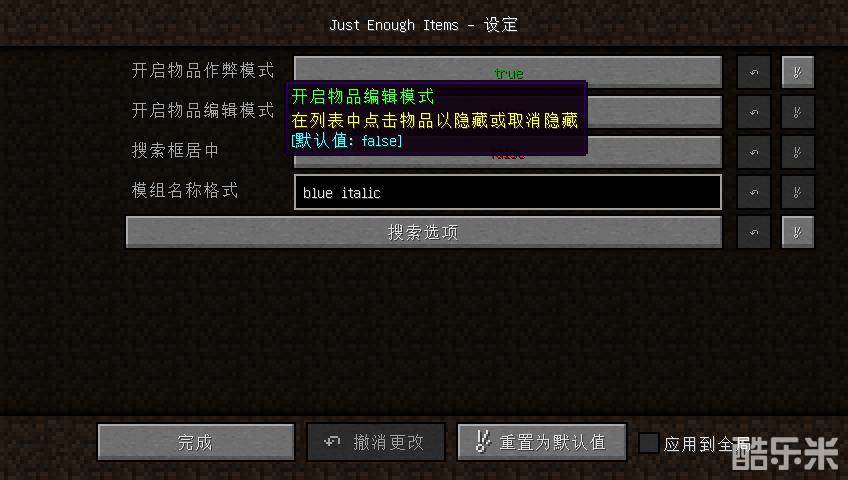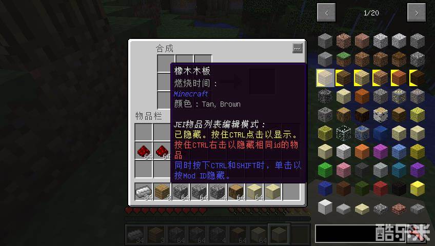 然后再回到JEI选项界面,将开启物品编辑模式设置为false,回到主界面。这时候再搜索关键词“木板”,就无法看见我们刚刚隐藏的几个物品了。