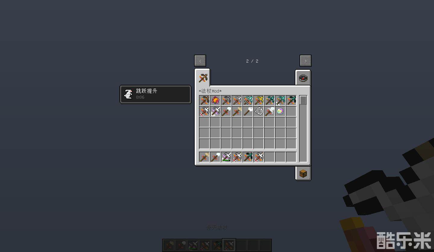 升天法杖:耐久80 右键可消耗5耐久让自己飞跃一大段距离,且获得一个落地前就会消散的跳跃提升BUFF (使用此法杖基本等于落地死)。