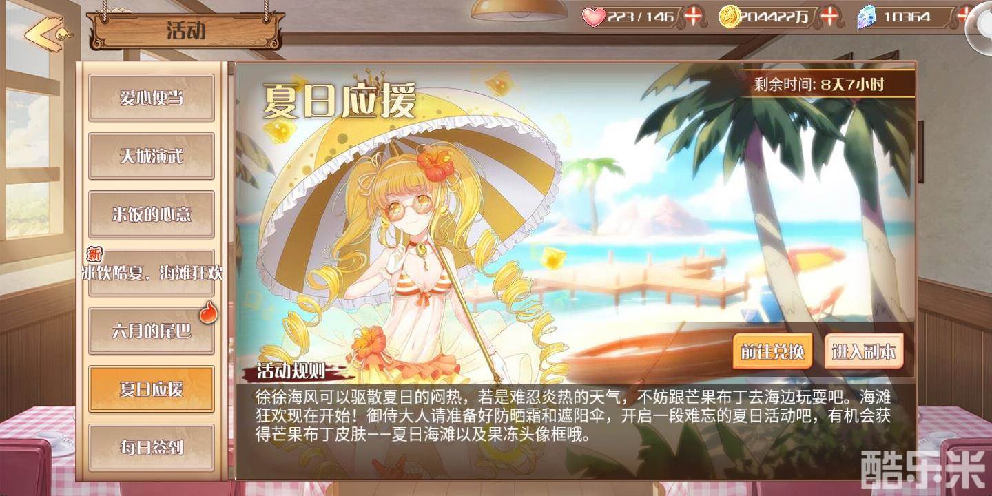 听闻芒果布丁还在剧情关卡中换上性感的比基尼外观,难道御侍大人们就不想看看当甜美可爱的芒果布丁一改以往的风格后又是怎样的画面吗?更何况还有种种豪礼可拿!限时夏日活动已开启,御侍大人现在不参与还待何时呢?赶快加入海滩狂欢的行列,和芒果布丁一起度过一段难忘的夏日祭吧!