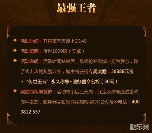 开服第五天,也就是明天,安卓1000服将迎来第一次攻沙活动。跟平日的攻沙不一样,这次攻沙成功的城主将可以额外获得38888元宝、“传世王者”的永久称号、30天的服务器命名权。命名权是什么概念?意味着你可以按照自己的想法,给安卓1000服起一个名字,可以是你的角色名,那时候,整个1000服的玩家将以你为名,活在你的庇佑之下。一想真的很酷!