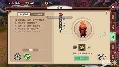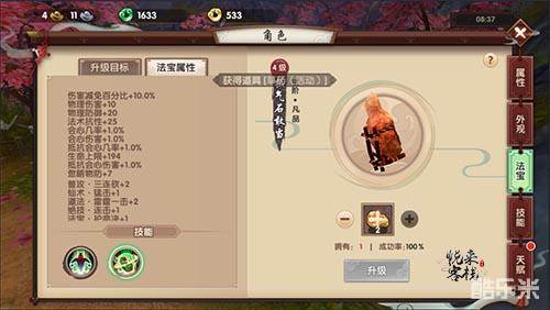 凡品法宝拥有五个被动属性,用道具激活第五个属性后,将可以提升品质激活新的属性,提升品质需要耗费其他的道具,并且提升品质本身不会产生被动属性。在品质提升成功后,地煞品级会比凡品多出三个技能,在此利用道具解锁三个技能后,便可以继续提升品级至天罡,天罡又要比地煞多出两个属性,在逐一学习之后,便需要等待满10级阶段,用道具对法宝进行阶段上的提升,每提升一个阶段,便可以获得一个主动法宝技能,也就相当于换了个新的法宝呢。