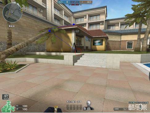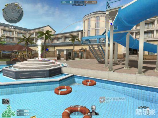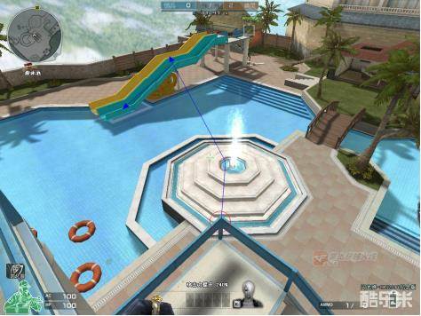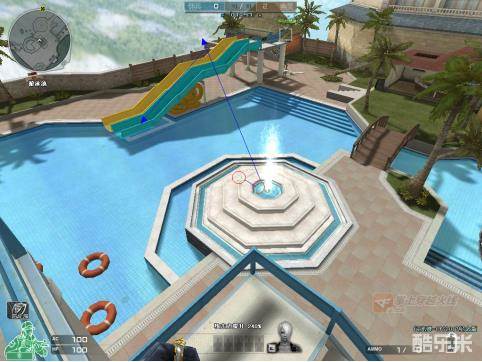 第一个红色圆圈为起跳点(新手练习推荐),新手尽量在起跳之前助跑一下,鼠标对准正前方,跳到小编画的第2个圆圈那里(这个圆圈为极限位置),调整鼠标方向即可利用喷泉可以直接喷到小滑梯上了,新手一定要把握住最佳起跳点,这才是精髓。(反跳无需反转鼠标,难度太大不推荐)