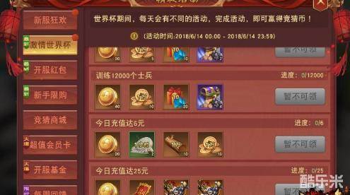 在上线的世界杯竞猜活动中,城主们每天登陆游戏就可以领取竞猜币、资源、装备材料等海量福利,同时城主们完成士兵训练、每日充值等任务,也同样可以获得竞猜币、资源、刷新令、晶石等道具,累计共百余的竞猜币,为《汉王纷争》城主们参与竞猜助力!