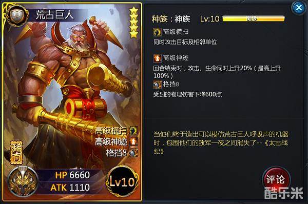 在很久很久以前,曾经有一张卡牌,它屡遭削弱,却依然强势,那就是荒古巨人,一张在内测期间被玩家誉为“策划大大的亲生儿子”的卡牌23333。好了,不开玩笑了,说到荒古巨人,可以说是神族的代表人物,高级横扫,拥有小型的aoe,搭配着高级神迹,是一个强大的存在,这一只有神族才拥有的特性更大大增强了神族的作战能力,回合结束时,生命和攻击同时百分比提升,最高可提升100%。简单来讲就是,一个5000血,1500攻击的神族卡牌,如果有神迹特性,那么最高可以变为10000血和3000攻击,是不是很吓人,荒古巨人熬过三回合,基本算是成长起来了。