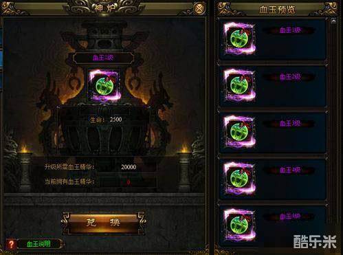 低级血玉可以通过消耗血玉精华进行升级,每级都可以给角色提供大量的生命值加成,让你在打BOSS、PK的过程中再也不用担心被秒了。