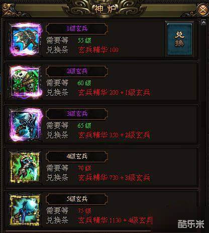 通过主界面上的神炉按钮,可以打开玄兵领取界面,玄兵共分为5级。