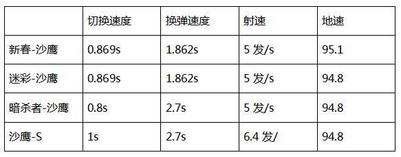 可能这一大推数据大家看起来比较混乱,所以小编还是来给大家简单分析一下。首先先讲一下暗杀者沙鹰,切换快但是射速慢。而迷彩沙鹰和新春沙鹰则都是切换快换弹速度也快,但是要注意的是新春沙鹰的地速更快,而且还比迷彩沙鹰多一发弹容量。也就是说,在这一环节是我们的新春版沙鹰强势胜出,全方位的强化外加10发子弹的大容量弹匣,可以说是非英雄级沙鹰中最强沙鹰枪械了!