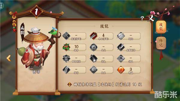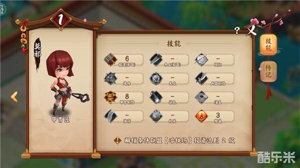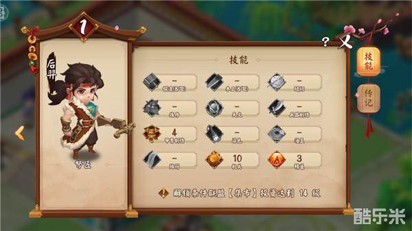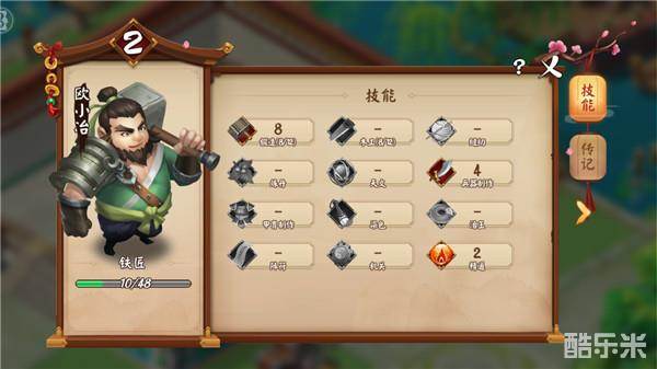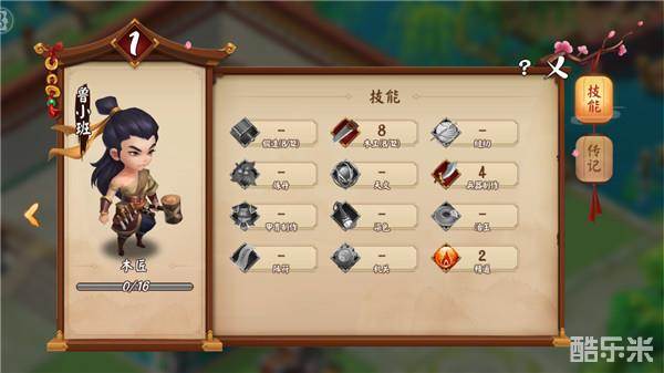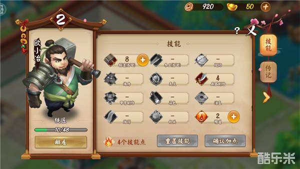 工匠升级的时候,就能看到该工匠头上的升级提示。点开升级的提升之后,就能对该工匠的技能点进行分布。