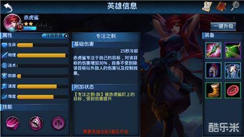 专注之刺:赤虎鲨专注自己的攻击目标,对该目标的伤害增加30%,自身不收到目标以外目标的伤害个控制效果。尽情的猎杀弱小的敌人吧。