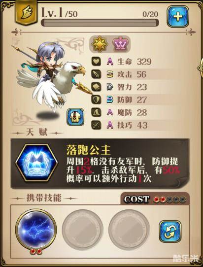 天赋:落跑公主:周围2格没有友军时,防御提升15%,击杀敌军后,有50%概率可以额外行动1次。