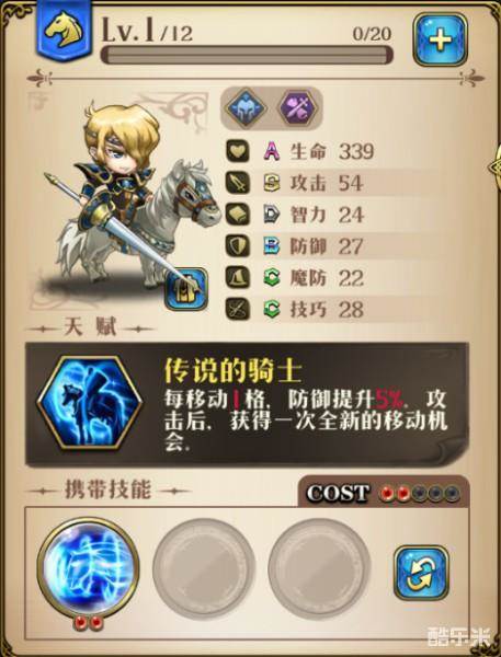天赋:传说的骑士:每移动1格,防御提升5%,攻击后,获得一次全新的移动机会。