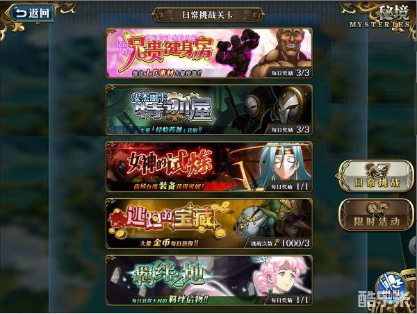 ⑤ 装备:装备不止能影响英雄的战力,还可以提供各种BUFF加成和技能效果,每天挑战日常秘境副本——女神的试炼,可以获得大量装备。