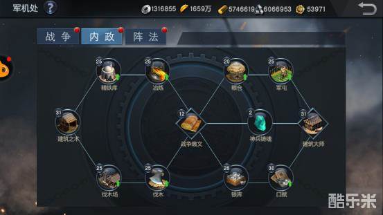 内政科技影响建筑升级和资源生产的效率,例如建筑升级时间缩短、建筑升级消耗减少、各种资源的产出提高等。
