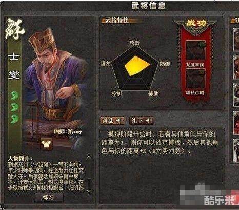 士燮字威彦,出生于交州的广信(今广西苍梧县)。其先祖为鲁国汶阳人,为躲避新莽末年的动乱而移居交州,经过六世到士燮的父亲士赐,士氏成为当地豪族,士赐曾于汉桓帝时任日南太守。士燮年轻时随颍川人刘陶学习《左氏春秋》,后被推举为孝廉,补任尚书郎,因公事而免官。其父士赐去世后,士燮被举为茂才,任巫县令一职。中平四年(187年),士燮被任命为交趾太守。士燮性格宽厚有器量,谦虚下士,中原的士人中前往依附避难的人数以百计,如袁徽、许靖、刘巴、程秉、薛综。士燮又沉醉于《春秋》,而为之作注解。以上文字皆摘自百度百科。可见,士燮的【避乱】以及【礼下】技能是有历史典故的,很好的契合了这个武将的生平。