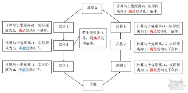 ⑤不考虑任何距离因素的影响,相邻武将的固定距离为1,自己与自己的距离为0,其余所有的距离因素都在这个基础上进行计算。