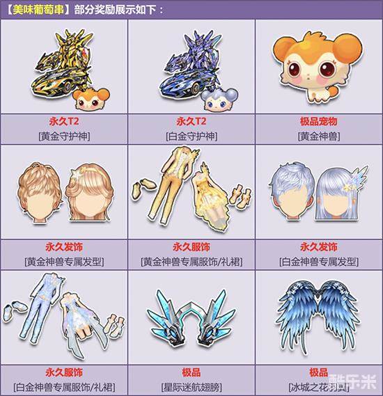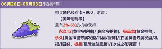 6月26日-8月3日,购买角色经验卡+900,附赠【美味葡萄串】,有机会得永久T2【黄金守护神】/【白金守护神】、极品宠【黄金神兽】、永久【黄金神兽专属发型/礼裙/服饰】/【白金神兽专属发型/礼裙/服饰】、极品【星际迷航翅膀】/【冰城之花羽翼】或其他奖励之一!其中核心极品期限型概率范围为:4%-6%,核心奖励永久型概率范围为:2%-4%,非核心奖励概率范围为:90%-94%。